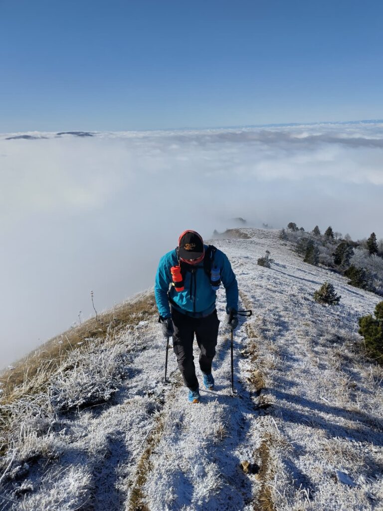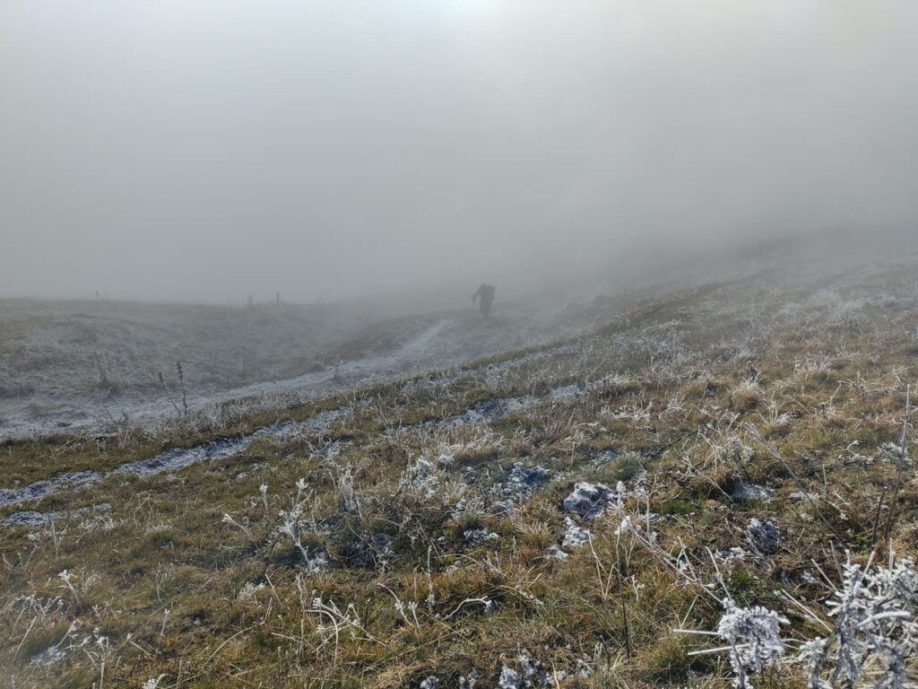 Coming back to the trail, all of us note that the path is almost impossible to find once lost. I will start looking for a postdoc soon, it’s a way to keep moving forward. But the ancientness of the trail gives it away once close. We move up into the clouds, now only our immediate surroundings remain clear to us. I see Maxime and Julien as they lead me forward. It should be said that Julien is a sailor and is experienced in navigating. His path may seem to wonder to those outside, but he has a map. I always wonder where he got it. We cross paths with a hiker coming down. From his viewpoint above, the trail is obvious, small depressions and bumps in the path are seen for what they are: parts of the path. He warns us of the sun ahead.